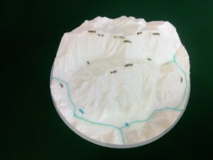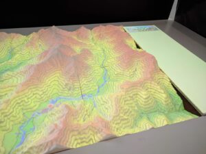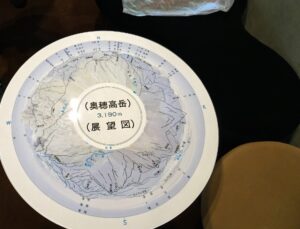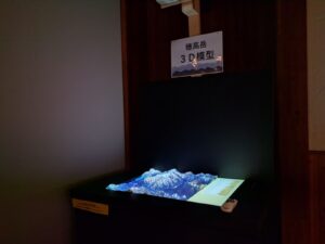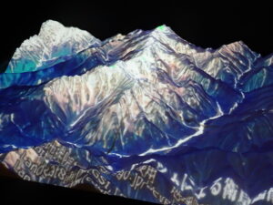 小型の立体模型や、ピンバッジなどの小物類、3Dメガネをつかった飛び出す地図の制作のほか、プロジェクションマッピングを使った大型機材の制作にも取り組んでいます。登山マップのイラストや、霧訪山、守屋山などの山頂方位盤のデザインも担当しました。これからも山の魅力に新たな彩りを添えるような作品を作り続けていきたいと思います。